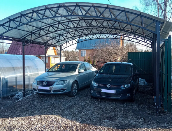 Навес для двух машины 6х6 м из сотового поликарбоната (толщина 10 мм) на металлическом каркасе обойдется в среднем от 290 000 рублей. Точную стоимость уточняйте у менеджеров!