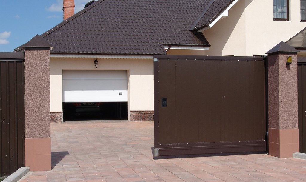 В целом, откатные конструкции достаточно компактные, потому что для открывания требуется относительно немного пространства вдоль забора. В полотно ворот допускается монтаж калитки с замком. Конструкция выдерживает сильные ветра и способна работать в любом климате. Из недостатков стоит выделить необходимость в свободном пространстве для отката ворот.