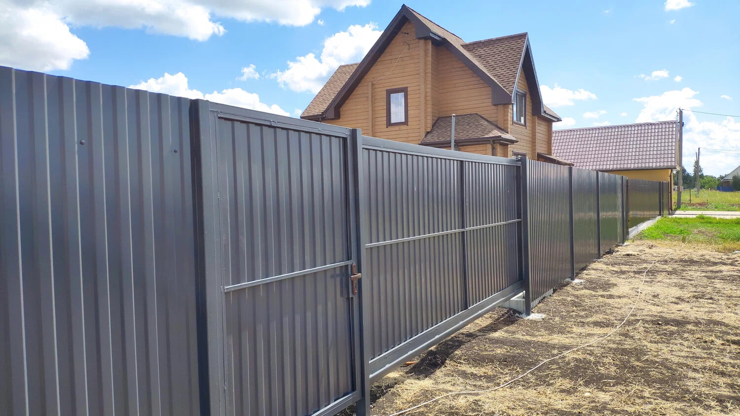 В поселке Хохлово был изготовлен забор из профлиста, а так же калитка и распашные ворота. Прочный, долговечный и экономичный вариант ограждения, состоящий из гофрированных металлических листов, закрепленных на каркасе из столбов и лаг. Они обеспечивают высокую приватность, защиту от шума и пыли, а также отличаются широкой палитрой цветов, устойчивостью к коррозии, благодаря чему популярны для дач и частных домов.