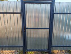 Нами был изготовлен забор из сетки-рабицы на каркасе с одной калиткой. Популярный выбор для дач и промышленных зон благодаря светопроницаемости, и отсутствию парусности. Сетка бывает оцинкованной, черной или с ПВХ-покрытием.