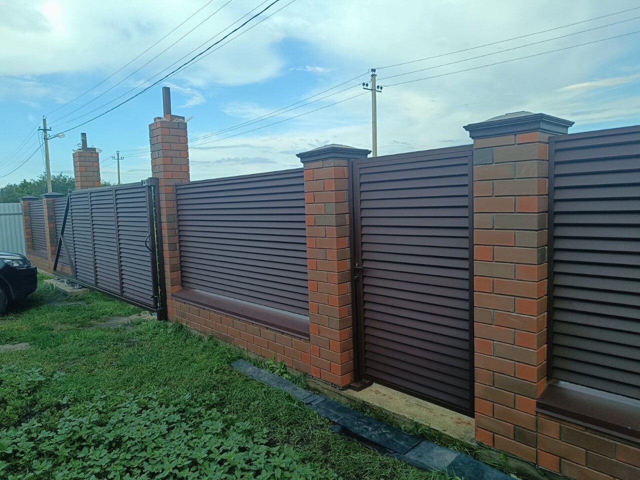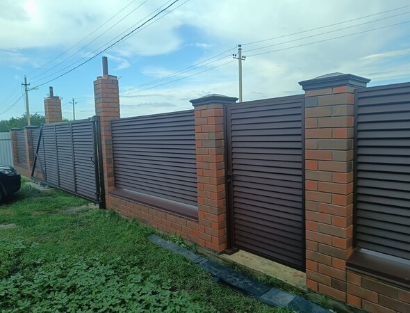 Комбинированный забор с кирпичными столбами установлен в загородном коттеджном посёлке. Конструкция установлена на ленточный фундамент, включает калитку и откатные ворота с автоматикой. Для заполнения пролётов между столбами использованы секционные жалюзи, окрашенные с двух сторон.