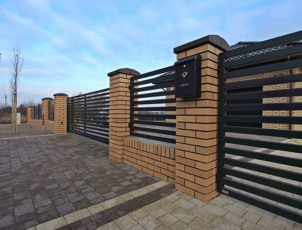 Комбинированный забор с кирпичными столбами установлен в загородном коттеджном посёлке. Конструкция установлена на ленточный фундамент, включает калитку и откатные ворота с автоматикой. Для заполнения пролётов между столбами использованы секционные жалюзи, окрашенные с двух сторон.